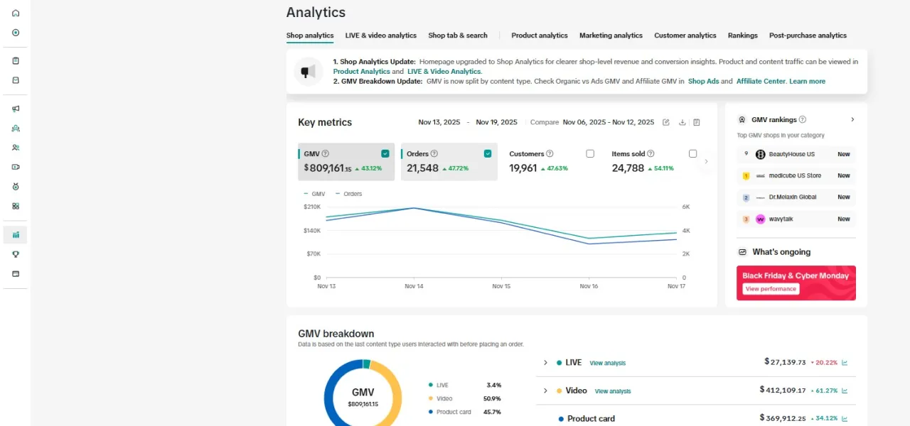 Much of the shop’s success comes from constant visibility across TikTok. Creator videos accounted for more than half of the total GMV, while high-performing product cards and occasional live shopping events contributed significantly to conversions. Daily content creation from diverse affiliates kept the products trending on the For You Page, ensuring a steady flow of new buyers. Behind the scenes, we worked continuously on optimization—adjusting pricing, updating images, testing different hooks, improving descriptions, and monitoring stock levels to maintain smooth order flow even during high-demand seasons like Black Friday and Cyber Monday.